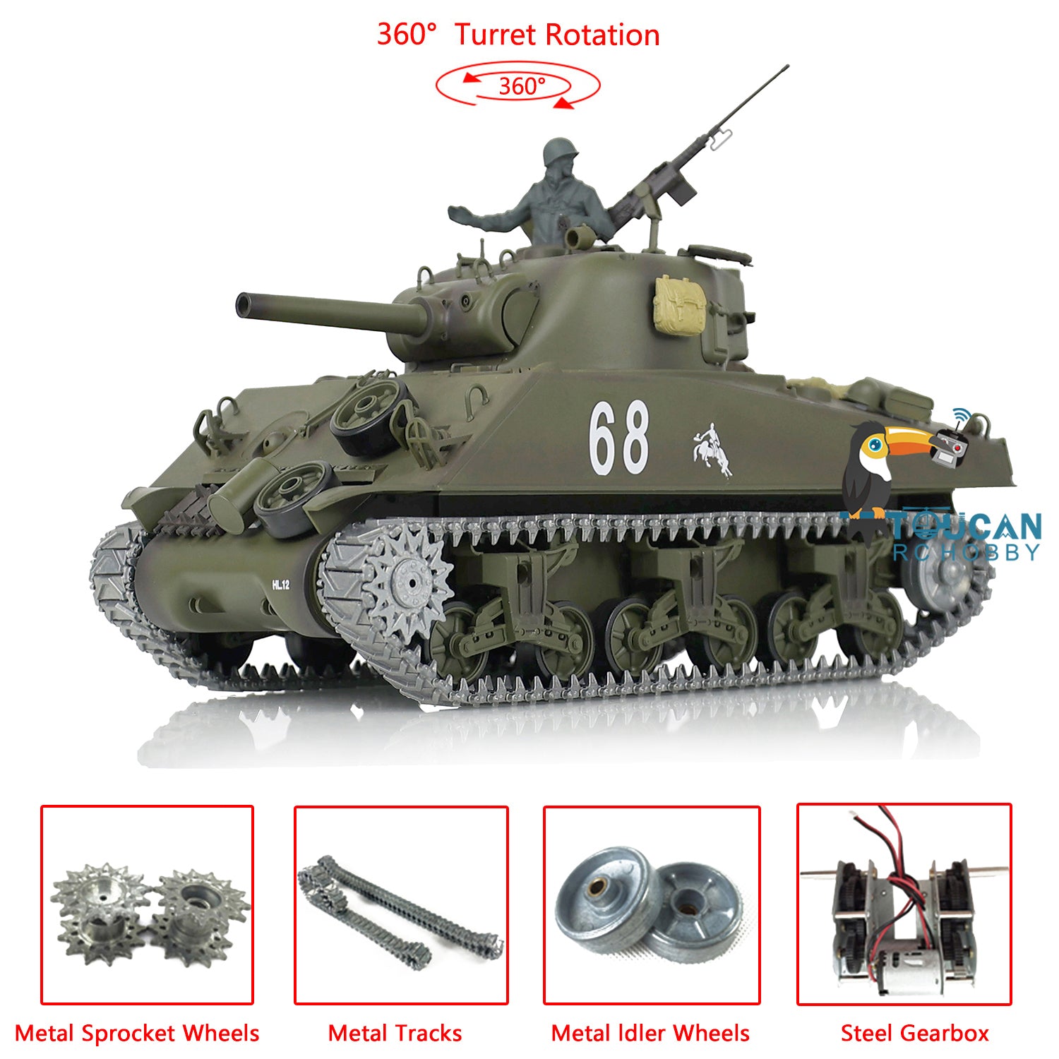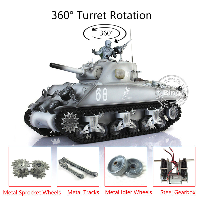 Henglong 1/16 TK7.0 Upgraded M4A3 Sherman Remote Control Tank 3898 W/ 360 Degrees Rotating Turret Metal Tracks Idler Sprocket Wheel