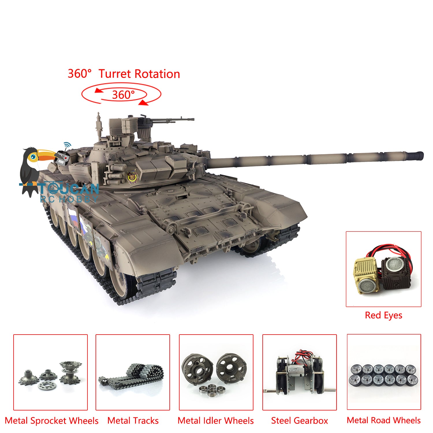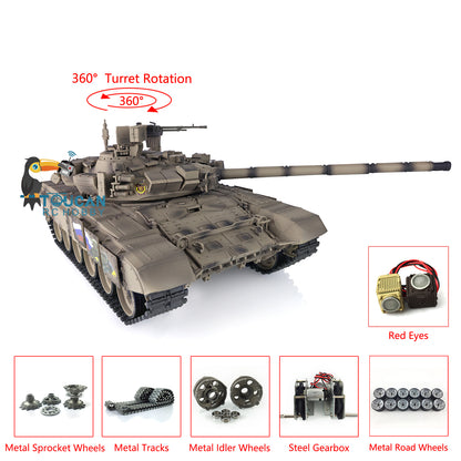 Henglong 2.4Ghz Russian T90 1/16 7.0 RTR RC Tank Model 3938 Red Eyes 360 Degrees Turret Metal Tracks Road Wheels Idlers Sprockets